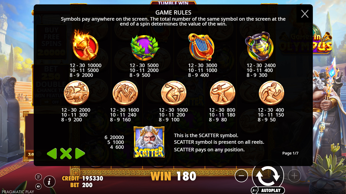 Τα σύμβολα του Games in Olympus είναι μια μείξη κλασικών στοιχείων και αθλητικών αναφορών. Τα σύμβολα χαμηλής αξίας εκπροσωπούνται από χρωματιστούς πολύτιμους λίθους, ενώ τα premium σύμβολα περιλαμβάνουν αντικείμενα όπως η άρπα και οι σταφύλες, που αποδίδουν υψηλότερες πληρωμές. Λόγω της υψηλής μεταβλητότητας και του μηχανισμού Pay Anywhere, το παιχνίδι είναι ιδανικό για παίκτες που απολαμβάνουν το ρίσκο και την ένταση των συνεχόμενων καταρρακτών. Το RTP 96.5% το καθιστά μια από τις πιο δίκαιες επιλογές στην κατηγορία του, προσελκύοντας παίκτες που αναζητούν την ποιότητα της Pragmatic Play σε ένα περιβάλλον γεμάτο δράση και ολυμπιακή δόξα.