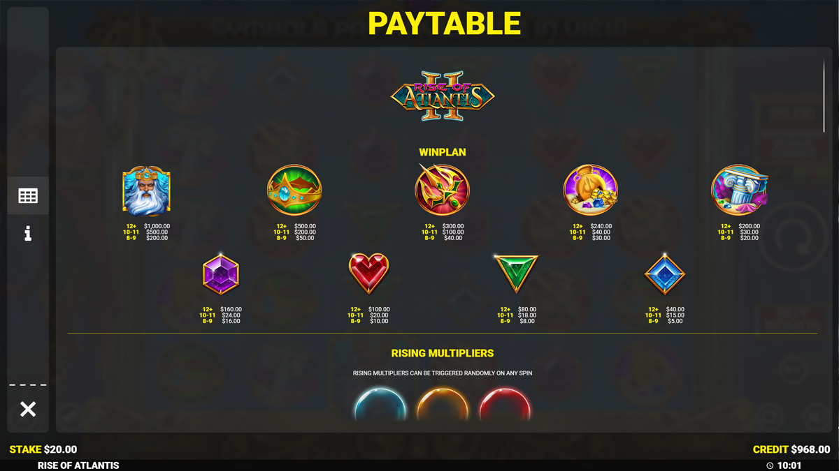 Στους τροχούς θα συναντήσετε 9 βασικά σύμβολα, με τα 4 χρωματιστά σχήματα τράπουλας να προσφέρουν τις χαμηλότερες πληρωμές και τα 4 θεματικά αντικείμενα (όπως κορώνες και αμφορείς) να αποτελούν τη μεσαία κατηγορία. Ο Ποσειδώνας είναι ο αδιαμφισβήτητος βασιλιάς των πληρωμών, αποδίδοντας 50x το ποντάρισμα για 12+ εικονίδια. Λόγω του μεσαίου-υψηλού ρίσκου και των επεκτεινόμενων μηχανισμών, το Rise of Atlantis 2 είναι ιδανικό για παίκτες που απολαμβάνουν τα Grid Slots και αναζητούν κάτι παραπάνω από ένα απλό 5×3 παιχνίδι. Το χαμηλό ανώτατο όριο πονταρίσματος (€10) το καθιστά ιδιαίτερα ελκυστικό για παίκτες που θέλουν να διασκεδάσουν για περισσότερη ώρα, κυνηγώντας τους μεγάλους πολλαπλασιαστές χωρίς να ρισκάρουν τεράστια ποσά ανά spin.