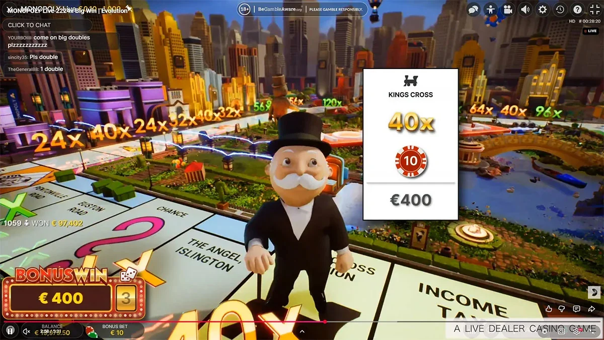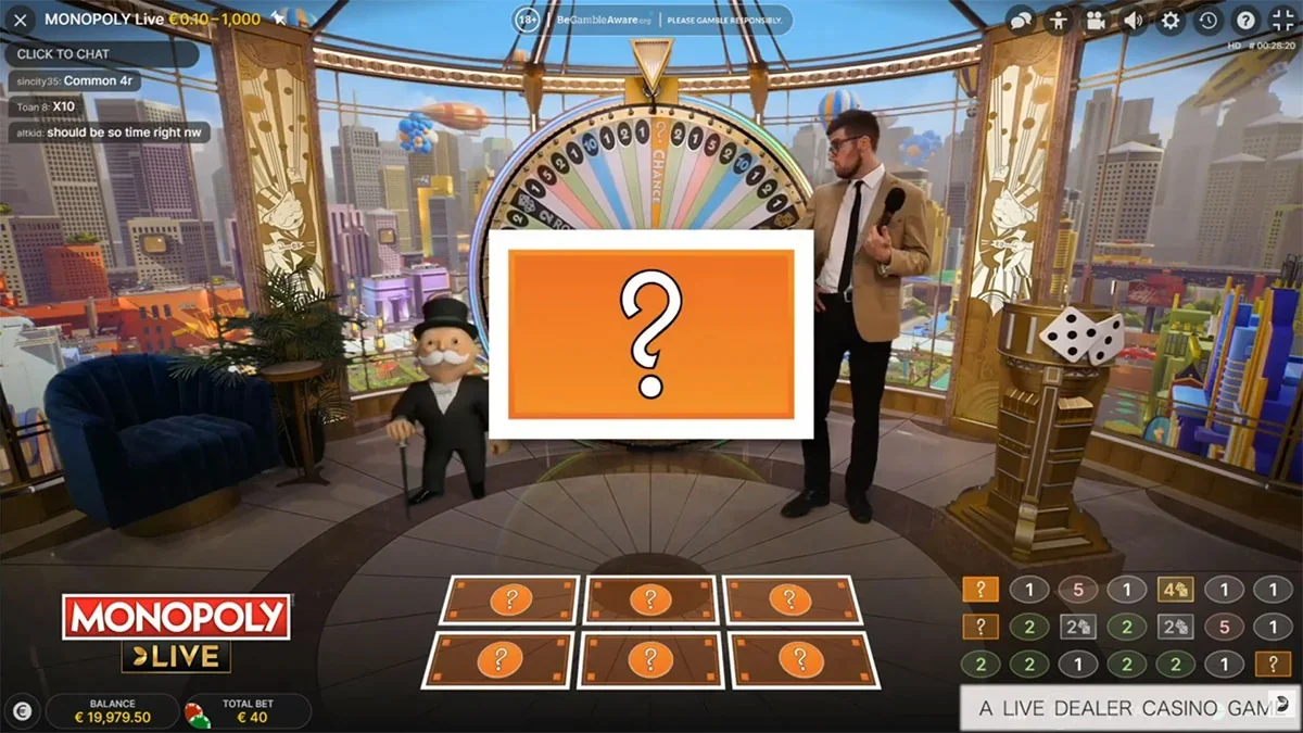 Το Monopoly Live είναι ένα εξαιρετικά συναρπαστικό ζωντανό παιχνίδι καζίνο που συνδυάζει τον παραδοσιακό μηχανισμό του τροχού χρημάτων με τα δημοφιλή στοιχεία του Monopoly, δημιουργώντας μια δυναμική και διαδραστική εμπειρία. Οι παίκτες προβλέπουν σε ποιο τμήμα θα σταματήσει ο τροχός του ζωντανού παρουσιαστή – επιλέγοντας τυπικά αριθμητικά τμήματα για άμεσες πληρωμές ή τμήματα μπόνους όπως 2 ROLLS (2 ΡΙΨΕΙΣ) και 4 ROLLS (4 ΡΙΨΕΙΣ) για είσοδο στο παιχνίδι μπόνους στο ταμπλό Monopoly επαυξημένης πραγματικότητας. Μόλις ενεργοποιηθεί το μπόνους, ο κύριος Monopoly κινείται σε ένα εικονικό 3D ταμπλό με ρίψεις ζαριών και απονέμει πολλαπλασιαστές και χρηματικά έπαθλα ανάλογα με το πού προσγειώνεται. Χάρη στους ζωντανούς παρουσιαστές, στις κάρτες Ευκαιρίας που μπορούν να δημιουργήσουν άμεσα κέρδη ή πολλαπλασιαστές, και στη δυνατότητα κερδών έως και 500.000 ευρώ, το Monopoly Live προσφέρει ενθουσιασμό και οπτική γοητεία που το ξεχωρίζουν από τα συνηθισμένα live παιχνίδια ή τους κουλοχέρηδες. Το RTP του περίπου 96,23% είναι ανταγωνιστικό για μια live game show, αν και η συχνότητα εισόδου στις λειτουργίες μπόνους μπορεί να επηρεάσει την αίσθηση της μεταβλητότητας και των μακροπρόθεσμων αποδόσεων. Συνολικά, είναι μια δημοφιλής επιλογή μεταξύ των παικτών που απολαμβάνουν τον συνδυασμό δράσης στον τροχό, νοσταλγίας από το γνωστό επιτραπέζιο παιχνίδι και λειτουργιών μπόνους υψηλής ενέργειας.