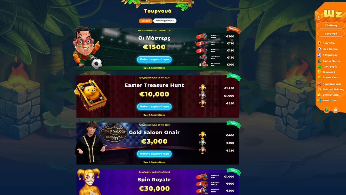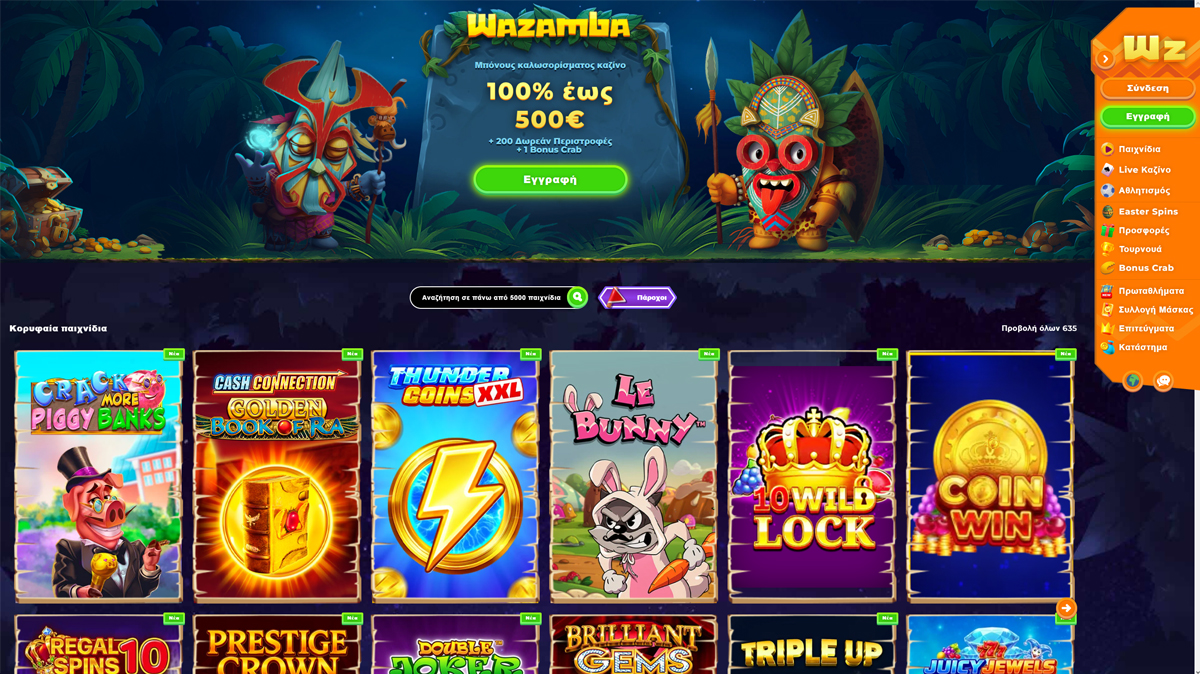 Το Wazamba Casino λειτουργεί με πλατφόρμα SoftSwiss και διαχειρίζεται από την εταιρεία Rabidi N.V. Προσφέρει ένα μοναδικό, περιπετειώδες περιβάλλον παιχνιδιού που συνδυάζει διασκέδαση με πρακτικότητα. Πλήρως αδειοδοτημένο από τις αρχές του Curaçao eGaming, απευθύνεται σε διεθνές κοινό με έμφαση σε ελκυστικό design και υψηλό engagement. Η πλατφόρμα διαθέτει επιμελημένη συλλογή άνω των 8.000 παιχνιδιών, συμπεριλαμβανομένων υψηλής μεταβλητότητας κουλοχέρηδων, προοδευτικών τζάκποτ και περισσότερων από 400 τραπεζιών με live dealers από κορυφαίους παρόχους όπως Evolution και Pragmatic Play Live. Αυτό που ξεχωρίζει το Wazamba είναι το gamified σύστημα ανταμοιβών – με αποστολές, επίπεδα και tribal tokens – που μετατρέπει το απλό παιχνίδι σε διαδραστική περιπέτεια. Παράλληλα με την πλούσια καζίνο προσφορά, ενσωματώνει responsive sportsbook που καλύπτει τα πάντα από ποδόσφαιρο και μπάσκετ μέχρι eSports, επιτρέποντας στους Έλληνες παίκτες να εναλλάσσονται άνετα μεταξύ καζίνο και live στοιχηματισμού μέσα σε ένα ενιαίο, οπτικά εντυπωσιακό περιβάλλον.