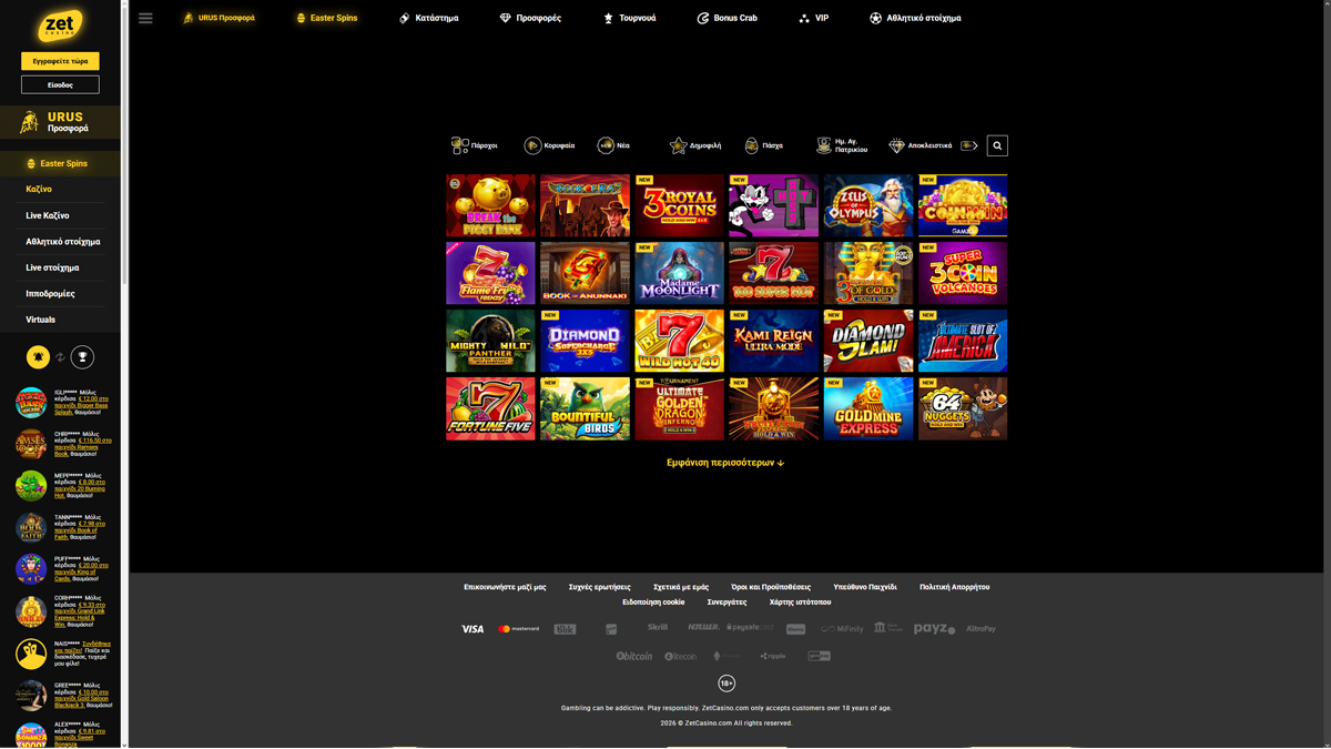 Το Zet Casino παρουσιάζεται ως ένα σύγχρονο online καζίνο με τεράστια ποικιλία παιχνιδιών, σχεδιασμένο για Έλληνες παίκτες που εκτιμούν την άνεση, την εύκολη πλοήγηση και την πρόσβαση απευθείας από τον browser. Η πλατφόρμα συνδυάζει καζίνο και στοιχήματα σε έναν ενιαίο λογαριασμό, με απλή και συνεπή δομή σε όλες τις ενότητες. Με πάνω από 7.000 παιχνίδια slots και περισσότερους από 200 τίτλους live casino και επιτραπέζιων, το Zet Casino εστιάζει κυρίως στην ποικιλία και την αξιοπιστία.